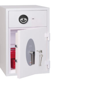 - Schubladenablage – Hochsichere ausziehbare Schubladenablage mit speziellem Abwurfsystem für maximale Sicherheit. Die Schubladenablage ist durch mehrere Verriegelungsbolzen gesichert und mit einem Hochsicherheits-Doppelbartschloss der VdS-Klasse I verschlossen.