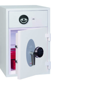 - Schubladenablage – Hochsichere ausziehbare Schubladenablage mit speziellem Abwurfsystem für maximale Sicherheit. Die Schubladenablage ist durch mehrere Verriegelungsbolzen gesichert und mit einem Hochsicherheits-Doppelbartschloss der VdS-Klasse I verschlossen.