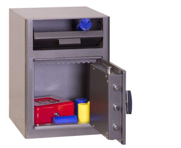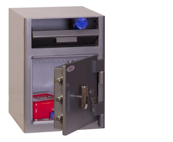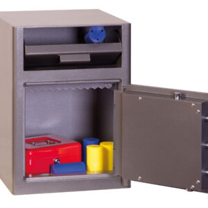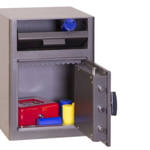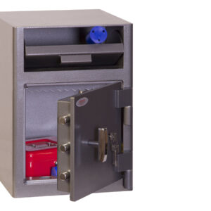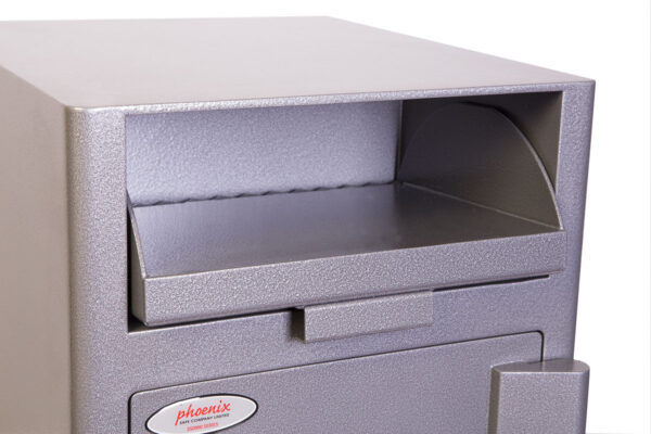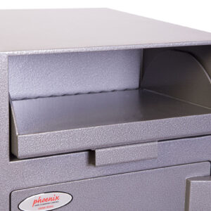 - ABGABEEINRICHTUNG – 100 H x 415 B x 220 T – Ausgestattet mit einer speziellen Phoenix-Prallplatte, um sicherzustellen, dass der Inhalt nicht herausgefischt werden kann. Verfügt außerdem über eine Nachtsperrplatte für erhöhte Sicherheit außerhalb der Geschäftszeiten.