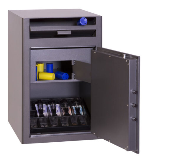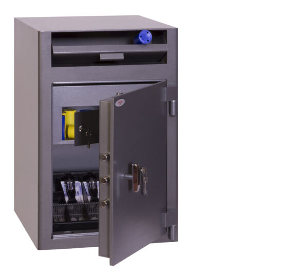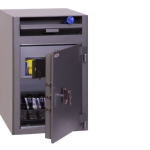- ABGABEEINRICHTUNG – 100 H x 415 B x 220 T – Ausgestattet mit einer speziellen Phoenix-Prallplatte, um sicherzustellen, dass der Inhalt nicht herausgefischt werden kann. Verfügt außerdem über eine Nachtsperrplatte für erhöhte Sicherheit außerhalb der Geschäftszeiten.