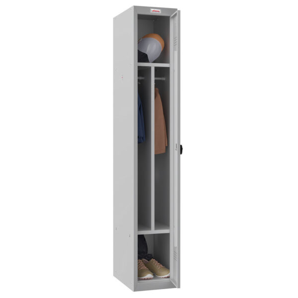- INNENAUSSTATTUNG – Lieferung mit festem Ober- und Unterboden, Kleiderstange und Kleiderhaken. Schließfächer mit voller Tiefe, in denen Mäntel und Overalls auf Standard-Kleiderbügeln untergebracht werden können.