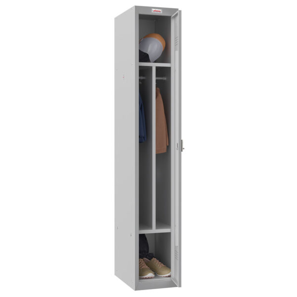 - INNENAUSSTATTUNG – Lieferung mit festem Ober- und Unterboden, Kleiderstange und Kleiderhaken. Schließfächer mit voller Tiefe, in denen Mäntel und Overalls auf Standard-Kleiderbügeln untergebracht werden können.