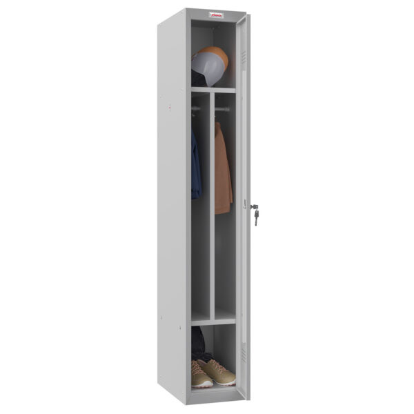 - INNENAUSSTATTUNG – Lieferung mit festem Ober- und Unterboden, Kleiderstange und Kleiderhaken. Schließfächer mit voller Tiefe, in denen Mäntel und Overalls auf Standard-Kleiderbügeln untergebracht werden können.