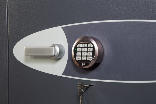 - VERSCHLUSS – Ausgestattet mit einem hochsicheren elektronischen Schloss der VdS-Klasse II mit Doppelsteuerung, Mastercode und Code. Zeitverzögertes Hochsicherheits-Doppelbartschloss der VdS-Klasse II.