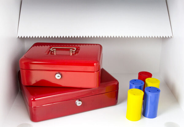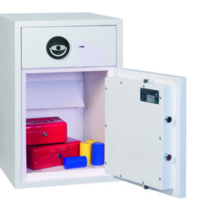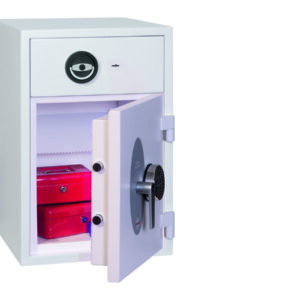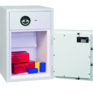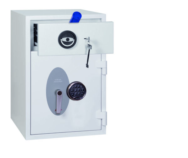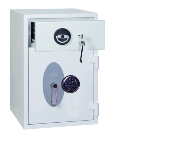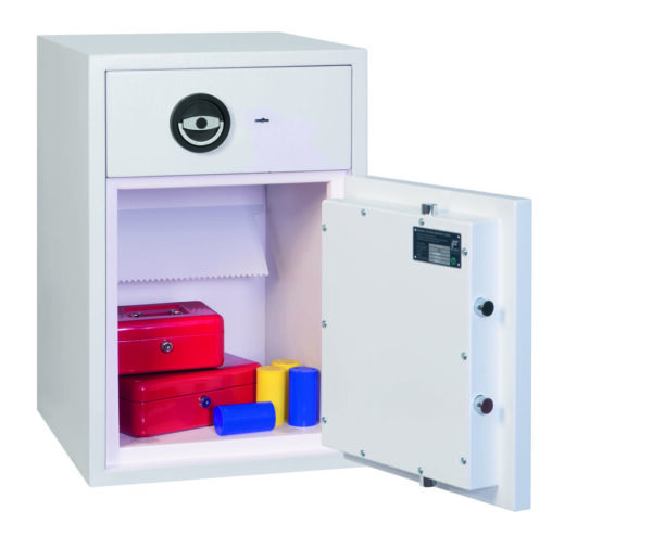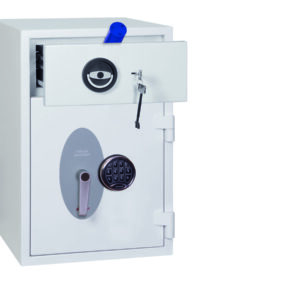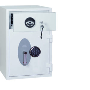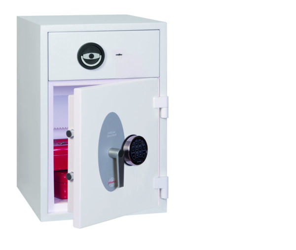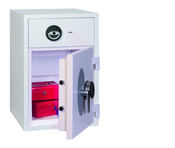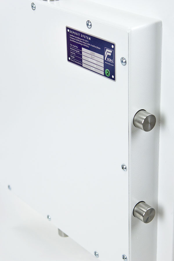 - Schubladenablage – Hochsichere ausziehbare Schubladenablage mit speziellem Abwurfsystem für maximale Sicherheit. Die Schubladenablage ist durch mehrere Verriegelungsbolzen gesichert und mit einem Hochsicherheits-Doppelbartschloss der VdS-Klasse I verschlossen.