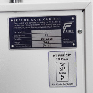 - BRANDSCHUTZ (PAPIER) – Getestet nach der schwedischen Papiernorm NT Fire 017-120, bietet 120 Minuten Brandschutz für Papierdokumente.