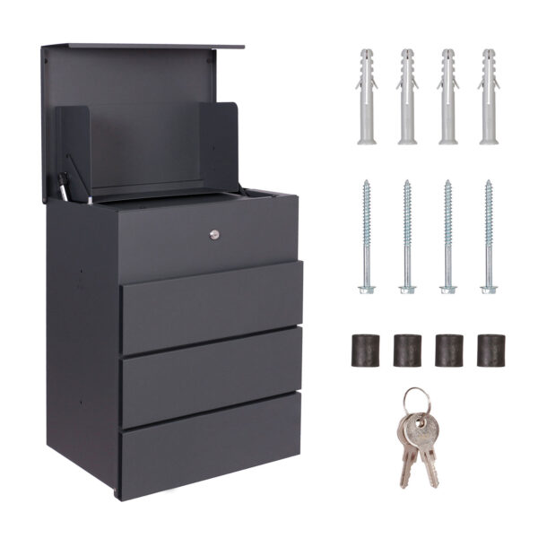- WASSERFESTIGKEIT – Entwickelt, um Ihre Pakete vor allen Wetterbedingungen zu schützen, mit einer geneigten Überhangoberseite und einer rostbeständigen, wetterfesten Pulverbeschichtung.