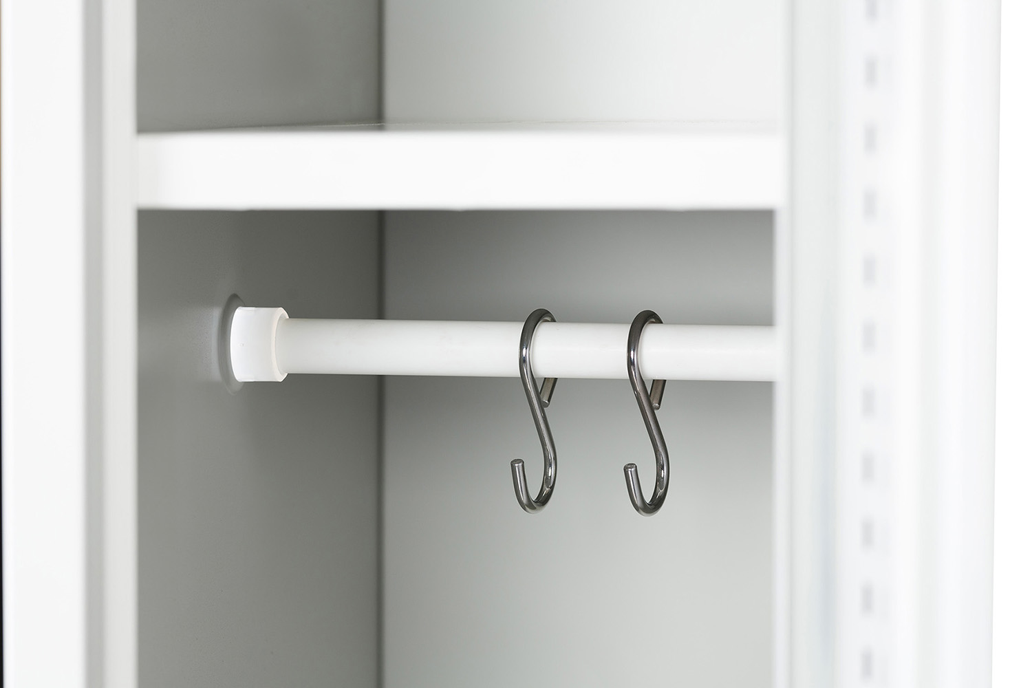 - INNENAUSSTATTUNG – Lieferung mit festem Regal, Kleiderstange und Kleiderhaken. Kann Mäntel und Overalls auf handelsüblichen Kleiderbügeln unterbringen.