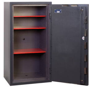 - VERSCHLUSS – Ausgestattet mit einem hochsicheren elektronischen Schloss der VdS-Klasse II mit Doppelsteuerung, Mastercode und Code. Zeitverzögertes Hochsicherheits-Doppelbartschloss der VdS-Klasse II.