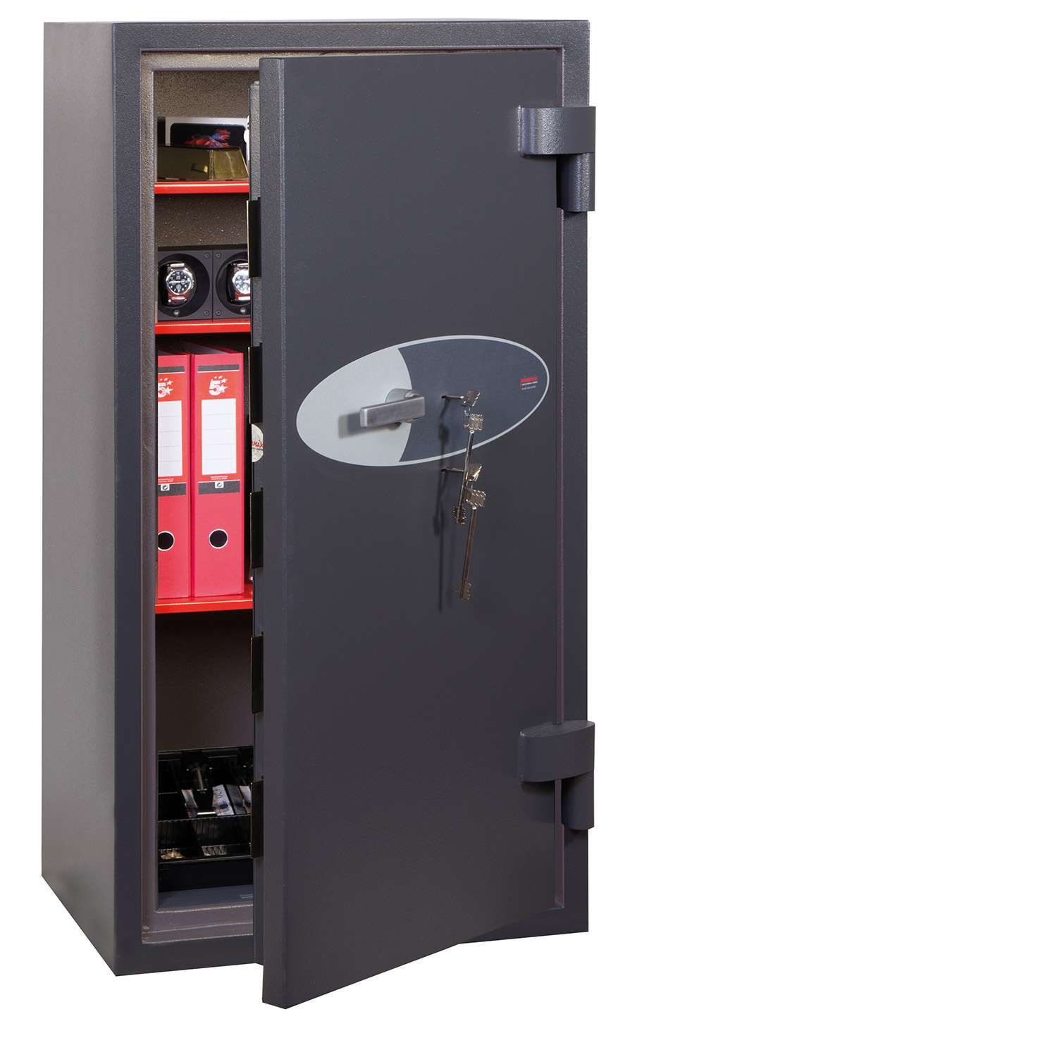 - FARBE - Mit hochwertiger, kratzfester Graphitgrau-Lackierung RAL7024 versehen. Geeignet für die Lagerung kontrollierter Arzneimittel, deren Wirkstoffgehalt 500 Gramm übersteigt.